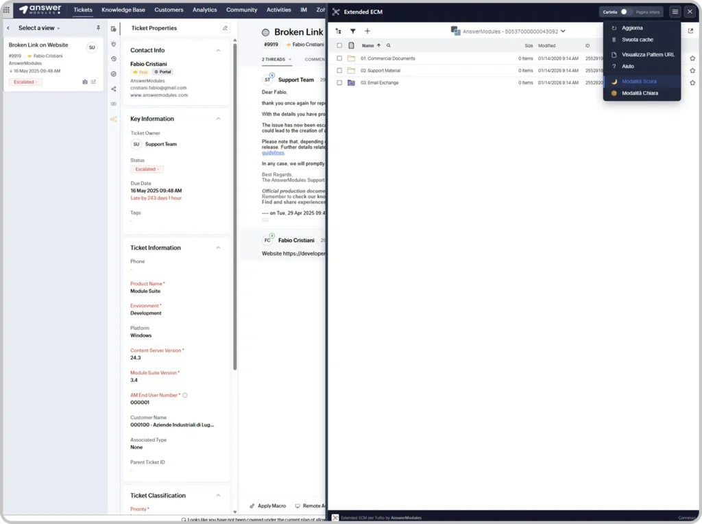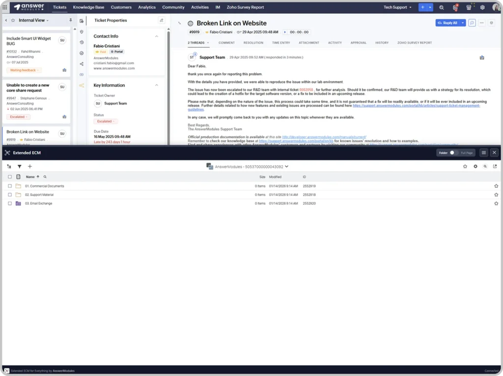 Once context is identified, the plugin immediately loads the relevant Business Workspace inside the application. Users can browse folders, upload documents, navigate content, and even use advanced OpenText views – without leaving their workflow.